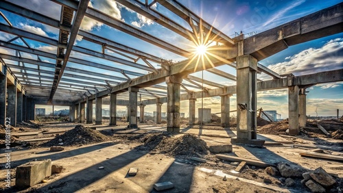 Sun-drenched Ruins of a Forgotten Structure, A Glimpse of Past Grandeur Through Shattered Beams and Crumbling Pillars