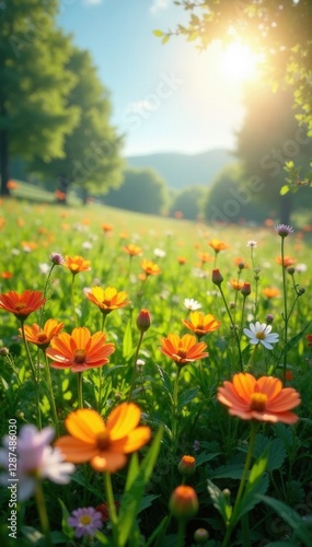 Sun-drenched spring meadow, vibrant wildflowers blooming, serene, spring meadow