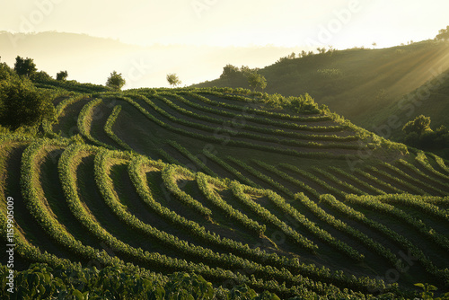 Sun-drenched terraced hillside vineyard at sunrise. Lush green rows stretch across the landscape.