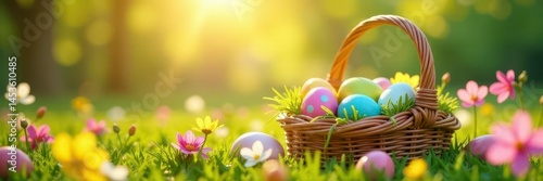 Sun-drenched wicker basket overflows with vibrantly colored Easter eggs nestled amongst blooming spring flowers , bunny, springtime