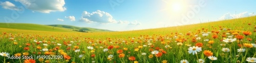 Sun-drenched wildflowers carpet a vast meadow, clear sky above , background, outdoor
