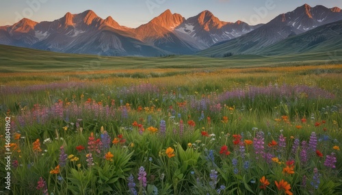 Sun-drenched wildflowers in a vast meadow, distant mountain peaks , sunlight, rural, peaceful