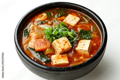 Sundubu Jjigae, A spicy stew made with uncurdled tofu, vegetables, sometimes seafood, and gochujang or gochugaru (Korean chili powder). isolated on white background