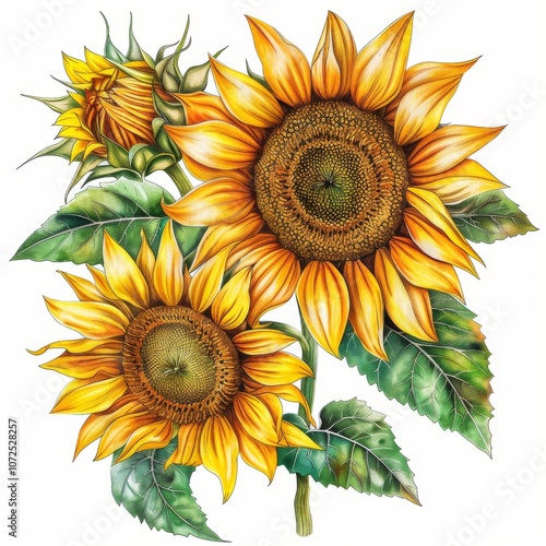 Sunflower Botanical Illustration, Sun Flowers Isolated, Sunflowers on White