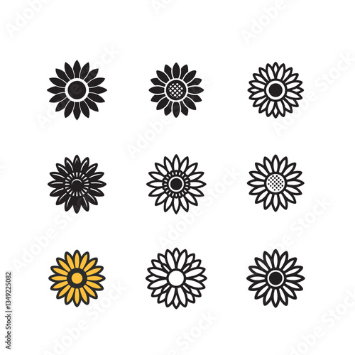 Sunflower Icon Set: Black, White, and Yellow Variations