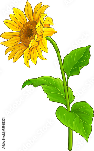 Sunflower Plant with Flower and Leaves Colored Detailed Illustration. Organic natural nutritional healthy food ingredient, vegetarian diet product.