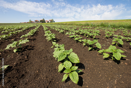 Sunflower plants. Agricultural field with young plants on a sunny day. The concept of agriculture. Raw material for vegetable oil.
