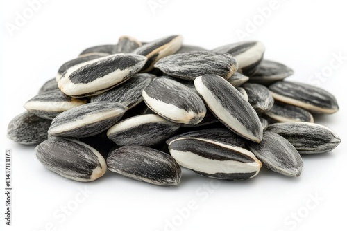 Sunflower seeds stacked in a neat pile showcasing their distinct black and white patterns