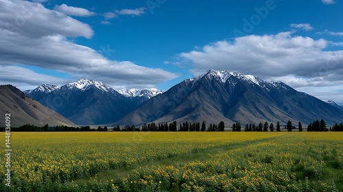 Sunflowers Bloom Beneath Snowy Peaks with New Zealand Landscape.