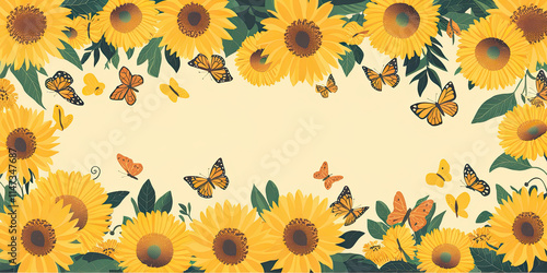Sunflowers Butterflies Summer Floral Border Nature Background