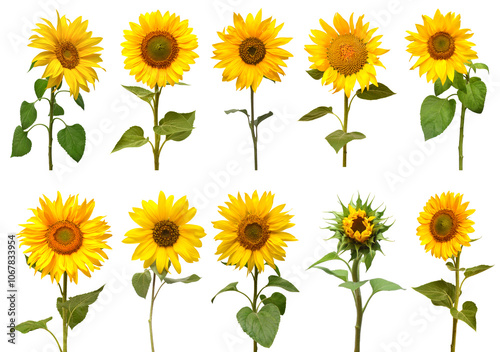 Sunflowers collection isolated on white background. Sun symbol. Flowers yellow, agriculture. Seeds and oil. Flat lay, top view