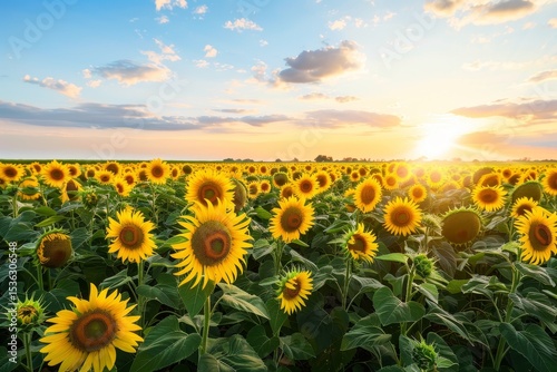 Sunflowers field at sunset. Vast field of sunflowers, vibrant yellow blooms, golden light
