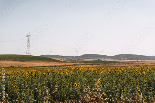 Sunflowers Field With High Voltage Pylons In The Countryside