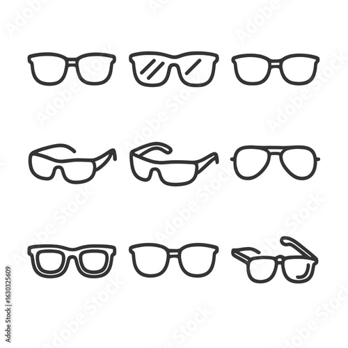 Sunglasses Icon Set. Outline icon set of sunglasses styles: classic sunglasses, mirrored lenses, polarized sunglasses, wraparound