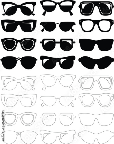 Sunglasses vector icon set for fashion accessory design summer eyewear style and sun protection Men and women glasses. hipster frame, fashion black plastic rims. Trendy Optics, modern shade graphic