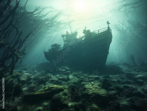 Sunken ship at the bottom underwater