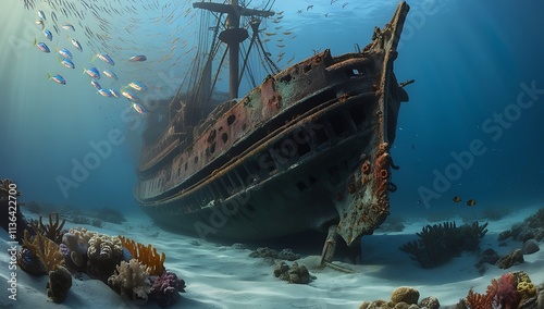 Sunken Shipwreck Resting On Ocean Floor With Fish