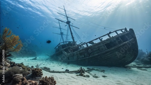 Sunken Shipwreck Resting on the Ocean Floor with Marine Life, Generative AI