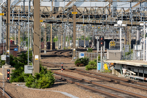 Sun-kissed summer morning at a bustling commuter train yard, where multiple tracks converge. The urban rhythm comes alive with boundless possibilities