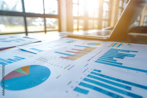 Sunlight bathes financial charts on a desk, showcasing daily market trends and business strategies in a bright office.