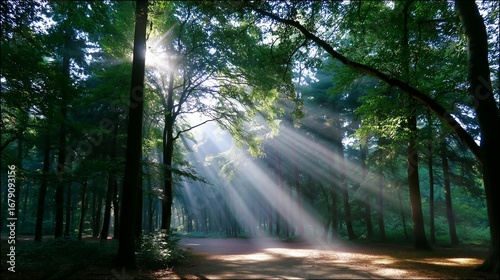 Sunlight beams filter through dense forest canopy in early morning hours