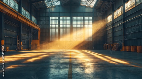 Sunlight beams illuminating empty industrial warehouse interior, spacious building with high windows, empty floor, large metal walls, peaceful quiet atmosphere, abandoned factory setting
