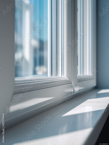 Sunlight casting soft shadows through clean white modern window frames onto a bright interior windowsill on a clear day