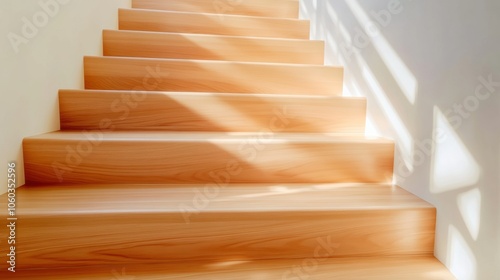 Sunlight casts geometric patterns on sleek wooden stairs, creating a warm, inviting ambiance, AI