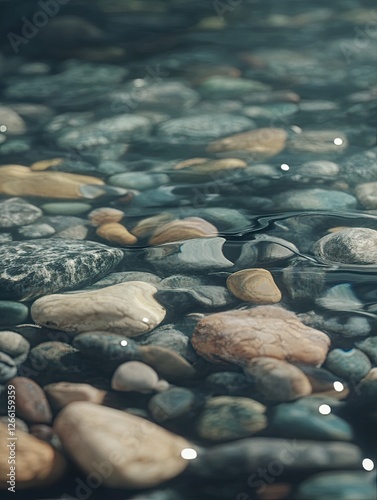 Sunlight dance on riverbed rocks creating tranquil water reflections