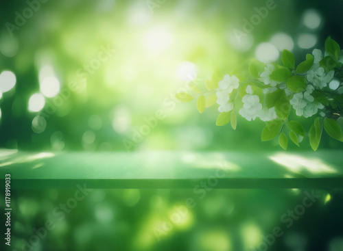 Sunlight dapples a green table nestled amongst blooming white flowers and lush green foliage. A tranquil, spring scene perfect for product display.