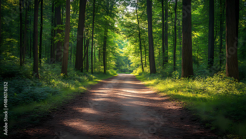Sunlight dapples a path winding through a lush green forest. The scene is peaceful and serene, inviting exploration.