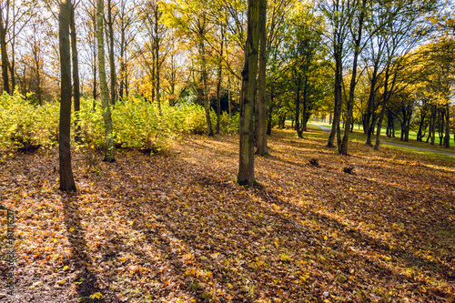 Sunlight falling through the forest in Autumn in the morning - Autumn background