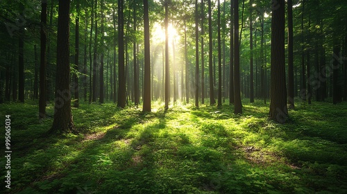 Sunlight filtering through a dense forest creating a serene, green ambiance.