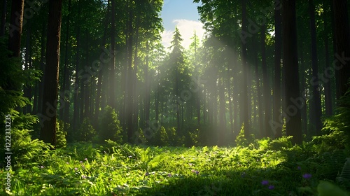 Sunlight Filtering Through Lush Green Forest in Tranquil Nature Scene