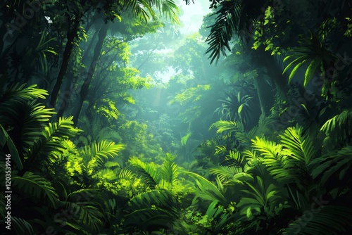 Sunlight filtering through lush green jungle canopy