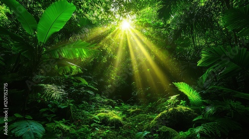 Sunlight filtering through lush green jungle foliage. Concept of nature and tranquility.