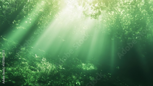 Sunlight filtering through lush green leaves, creating a serene and tranquil atmosphere in a mystical forest.