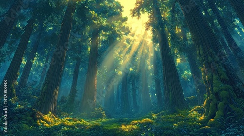 Sunlight filtering through towering pine trees, illuminating a mossy forest floor in early morning mist.