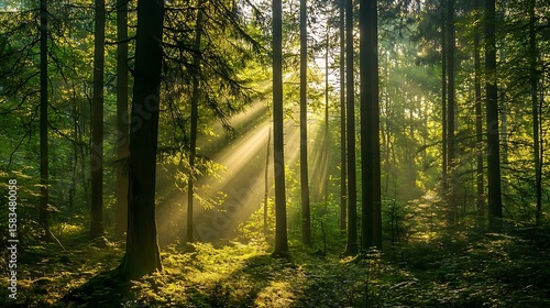 Sunlight Filtering Through Trees in Forest Landscape, Creating a Serene and Magical Ambiance