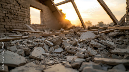 Sunlight Filters Through a Crumbling Structure of an Abandoned Building with Rubble and Debris Underfoot at Sunset, Evoking Decay and Desolation