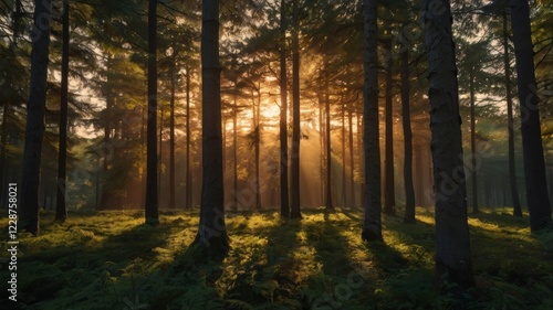 Sunlight Filters Through a Dense Forest of Tall Trees at Sunrise or Sunset Creating a Golden Glow