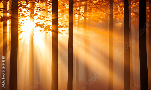 Sunlight filters through autumn trees, casting warm beams into a serene forest