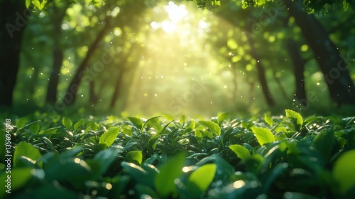 Sunlight filters through lush green leaves illuminating a vibrant forest floor in the early morning