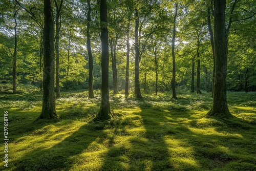 Sunlight filters through lush green trees in a serene forest setting during late afternoon, highlighting the vibrant foliage and soft ground cover