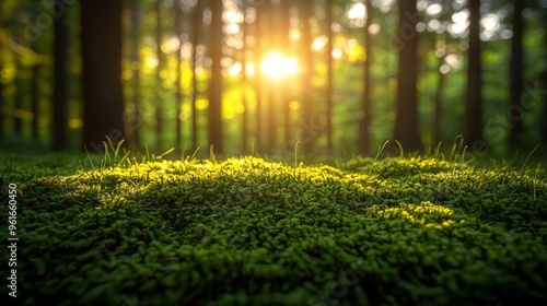 Sunlight filters through tall trees, illuminating lush green moss in a tranquil forest at dusk