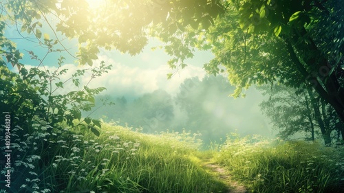 Sunlight filters through trees onto serene forest path