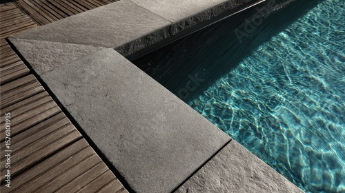Sunlight gleaming on turquoise waters, crystal clear pool surrounded by sleek gray stone and warm wooden decking, embodying luxurious outdoor living design