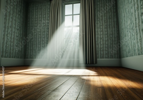 Sunlight illuminates a hardwood floor in an empty room with patterned walls and a window with curtains. Warm light creates a peaceful atmosphere. The