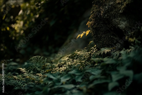 Sunlight illuminates a small plant growing from a rock surrounded by lush greenery.