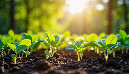 Sunlight illuminating young garden plants in spring, growth and renewal